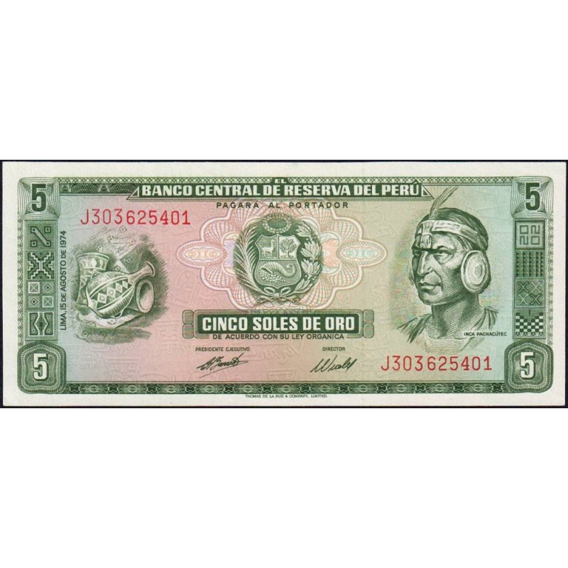 Avers : A gauche anciennes poteries traditionnelles, au centre emblème du pays, à droite portrait du chef inca Pachacútec (1400-1471) premier empereur de l'empire inca de 1438 à 1471