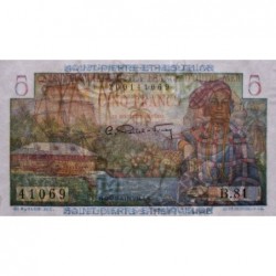 Revers : Femme des Antilles françaises en habits traditionnels accoudée sur une corbeille de fruits, maison créole, palmiers, montagne