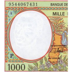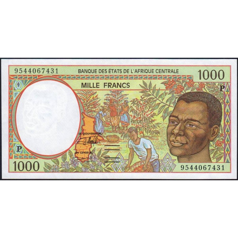 Avers : Carte de l'Afrique centrale, trois femmes et un homme récoltant des baies de café, portrait d'un homme