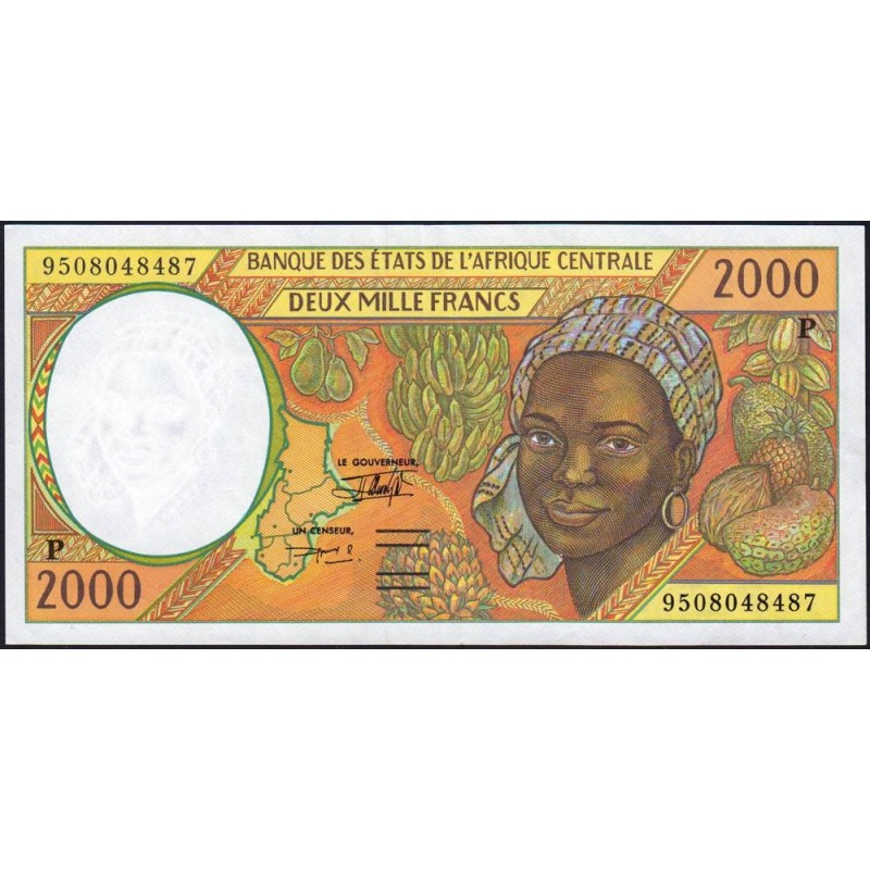 Avers : Carte de l'Afrique centrale, fruits divers, portrait d'une jeune femme portant un foulard