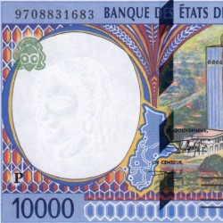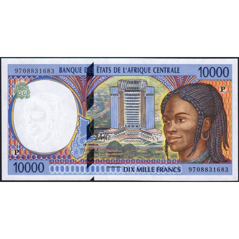 Avers : Carte de l'Afrique centrale, bâtiment de la BEAC à Yaoundé, portrait d'une femme coiffée de tresses traditionnelles