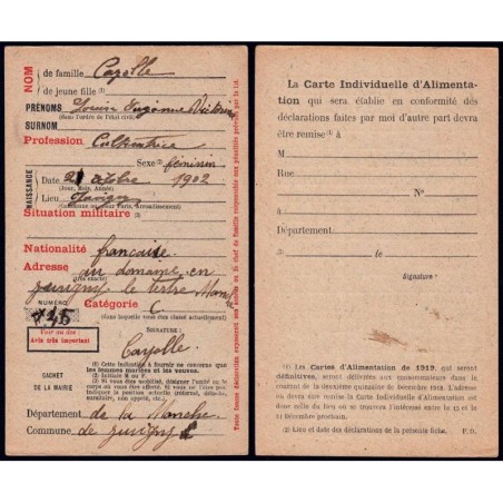 Demande carte individuellle d'alimentation - Catégorie C - 1918 - Juvigny-les-Vallées (50) - Etat : SUP