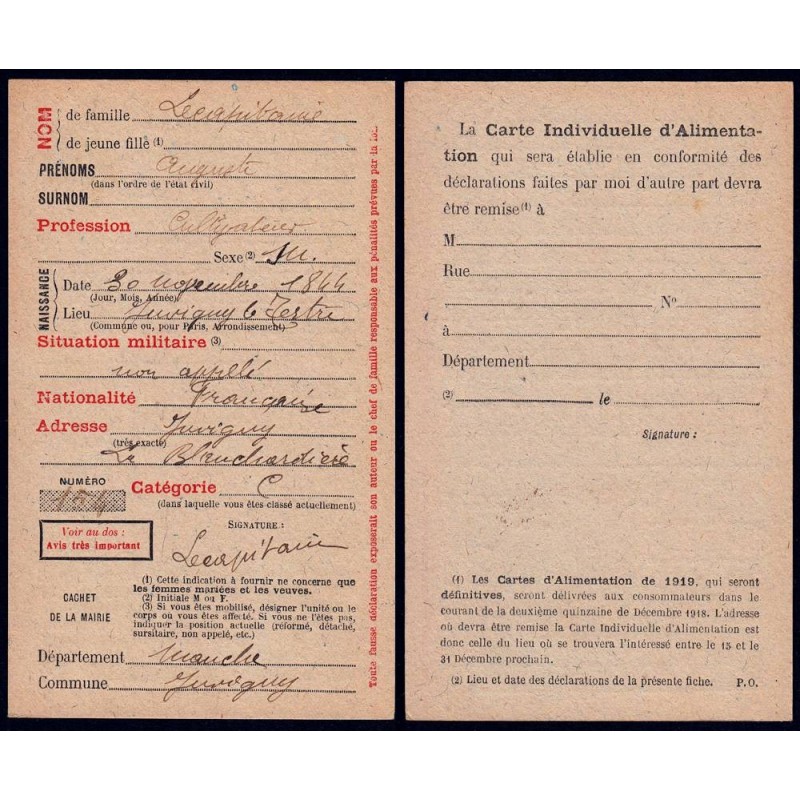 Demande carte individuellle d'alimentation - Catégorie C - 1918 - Juvigny-les-Vallées (50) - Etat : SUP