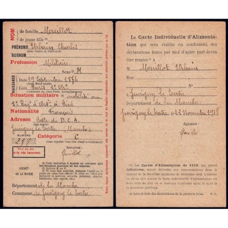 Demande carte individuellle d'alimentation - Catégorie C - 1918 - Juvigny-les-Vallées (50) - Etat : SUP