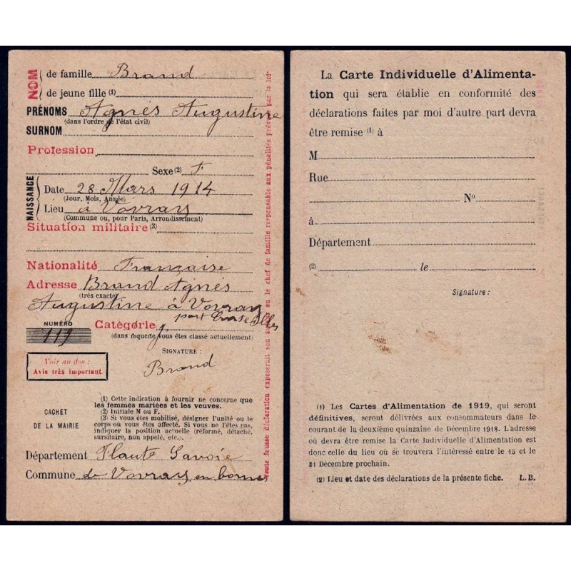 Demande carte individuellle d'alimentation - Catégorie J - 1918 - Vovray Cruseilles (74) - Etat : SUP