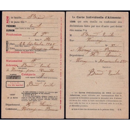 Demande carte individuellle d'alimentation - Catégorie J - 1918 - Vovray Cruseilles (74) - Etat : SUP
