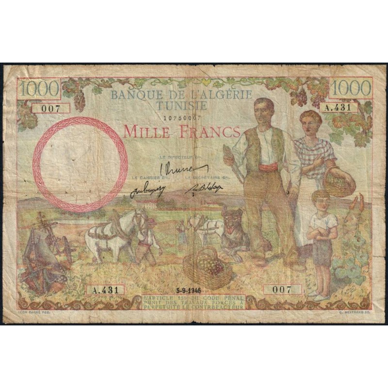 • Tunisie - Pick 26_2 - 1'000 francs - Série A.431 - 05/09/1946 - Etat : TB-