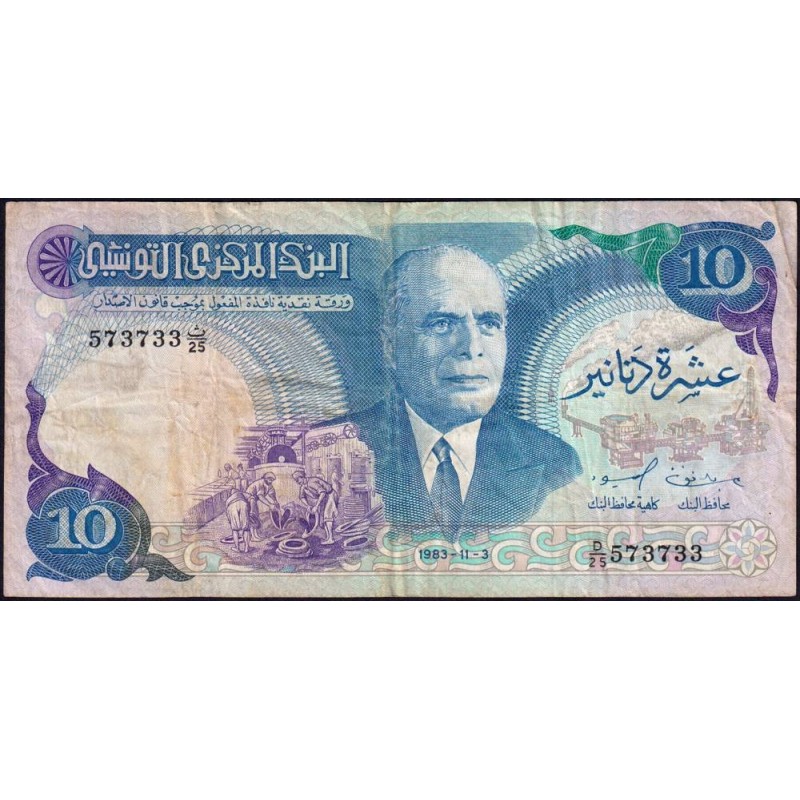Avers : Portrait de Habib Bourguiba (1903-2000) président de 1957 à 1987, pressage des olives dans une usine de fabrication d'huile d'olive, plateforme pétrolière d'Ashtart dans le golfe de Gabès