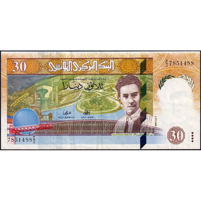 Avers : Portrait du poète Aboul El Kacem Chebbi (1909-1934), colonnes antiques, pont moderne, échangeur d'autoroute